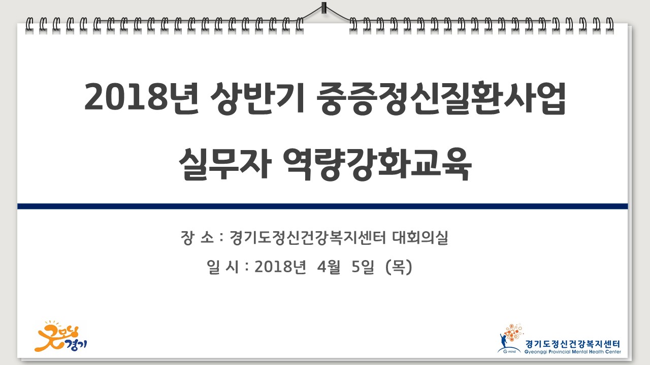 2018년 4월 5일 경기도정신건강복지센터 대회의실에서 상반기 중증정신질환사업 실무자 역량강화 교육이 진행되었습니다. 이번 교육은 사례관리에 필요한 중증정신질환자의 정신역동을 통한 치료적 접근방법 / 회복관점으로 바라본 사례관리 서비스 계획 수립 및 실천이라는 주제의 강의로 구성되었습니다. 실제 사례관리를 하는 실무자 선생님들께 사업 수행에 있어 도움이 되었길 바라며, 하반기에 있을 교육에도 많은 관심과 참석 부탁드립니다. |