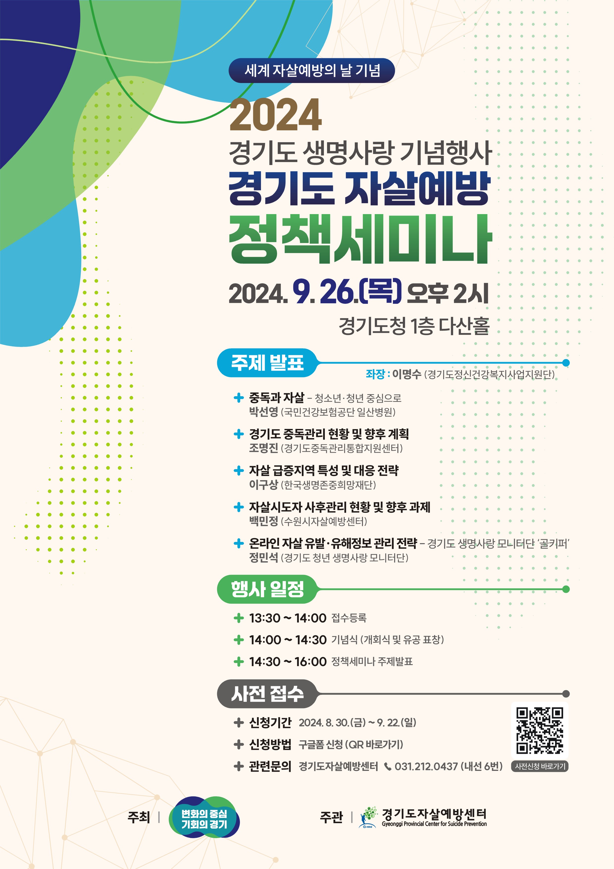 | 제목 | 2024 생명사랑 기념행사 「경기도 자살예방 정책세미나」 - 참석 안내 |